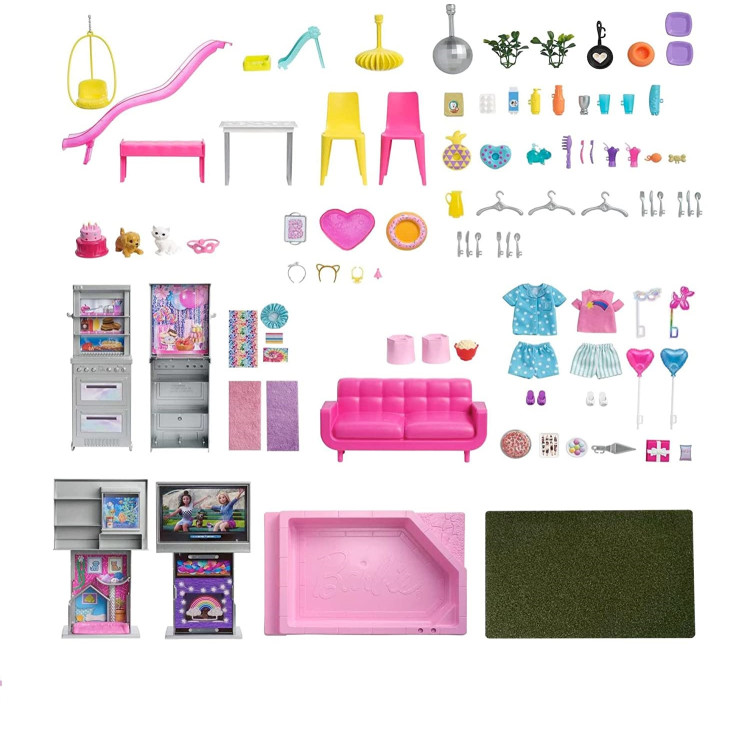 Этот кукольный домик шириной 102 см и высотой 108 см завлекает к игре со всех сторон. Три этажа и 10 игровых зон создают часы веселого времяпрепровождения с самого начала распаковки! Он полностью меблирован и состоит из: гостиной, спальни со шкафом, ванной комнаты, кухни, столовой, комнаты для вечеринок с кабинкой для ди-джеев, зоны для барбекю, горки на втором этаже с бассейном на улице, балконом с подвесной качелей-гамаком и игровым площадкой для домашних животных с собственным бассейном и горкой. Терраса на третьем этаже приглашает провести время на открытом воздухе. Поднимите всех вверх на лифте, который вмещает 4 куклы или одну куклу Барби в коляске. Зал для вечеринок на верхнем этаже ослепляет диско-шаром и и подсвечивающейся стойкой ди-джея для настоящего праздника. Наполните бассейн водой, чтобы поплескаться, понежитесь на солнышке и устройте свидание с домашними животными в бассейне для щенков и на горке. Прикрепите горку, чтобы куклы Barbie могли скользить прямо в воду. Дети смогут обустроить дом по своему вкусу, меняя аксессуары, чтобы создать дизайн своей мечты! Лужайку и бассейн можно расположить на первом и третьем этажах, а горку закрепить в 4-х разных местах. Здесь есть все, что нравится фанатам в оригинальной версии, а также премиальные детали, бассейн с изменением цвета в зависимости от емпературы воды, аксессуары для вечеринок и т.д. Фантастические функции оживают одним прикосновением пальца! Создайте нужную атмосферу с помощью реалистичных звуковых эффектов, встроенного света, имеющего восемь цветовых вариантов, а также пяти песен, включая специальную песню на день рождения, и трех различных настройках (такими как день, ночь, и вечеринка)!