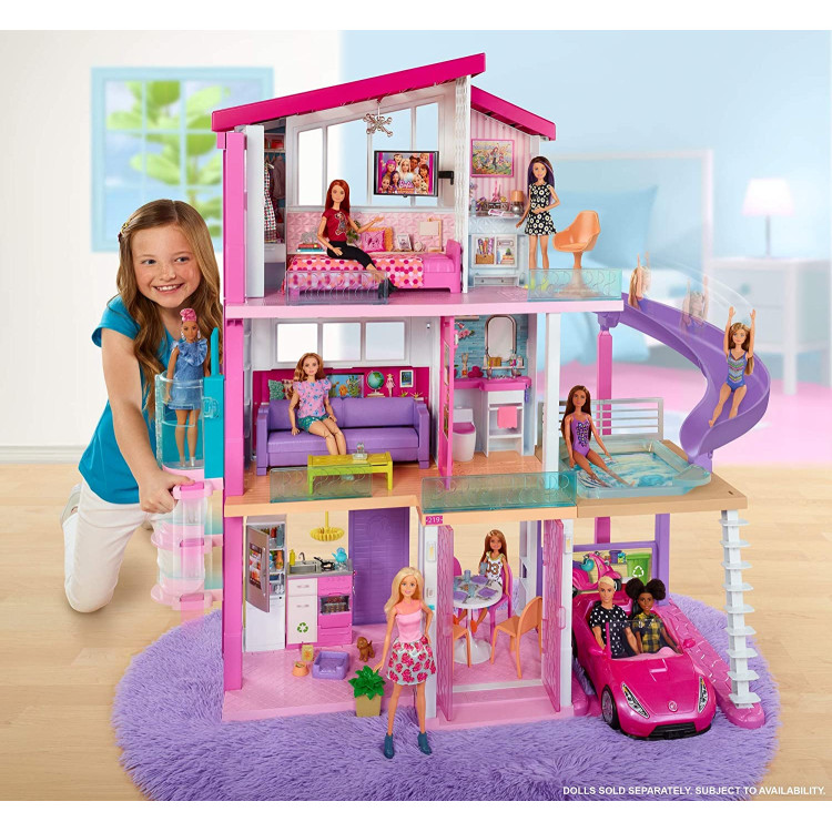 Трехэтажный игровой дом, который состоит из 8 комнат: столовая, кухня, спальня, гостиная, ванная комната, кабинет, навес для автомобиля, бассейн с горкой. Есть лифт для 4 кукол.