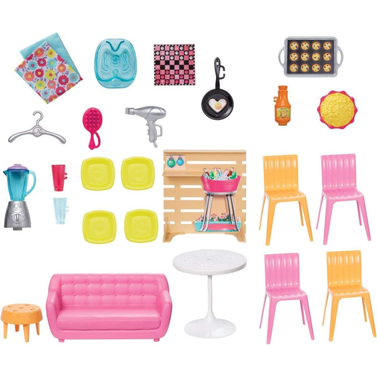 В набор также входят аксессуары: диван, обеденный стол, стульчики, блендер, тарелки, барбекю, фен и щетка для волос, маленький стульчик и ванночка для ног, полотенца и несколько видов продуктов питания.