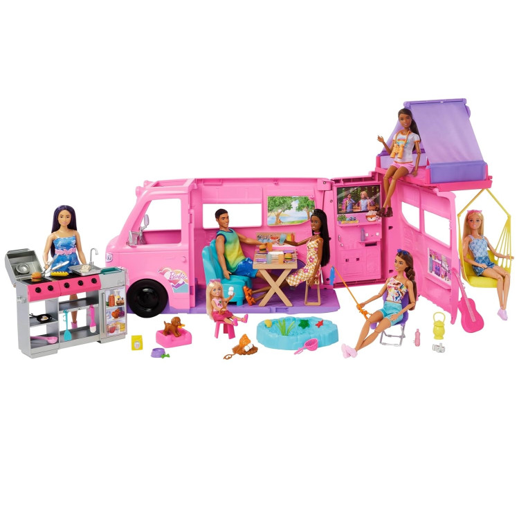 Отправляйтесь в незабываемое путешествие на природу вместе с Barbie Dream Camper – огромным кемпером для настоящих исследователей, открывающим перед детьми мир приключений, свободы и веселья! В этом наборе есть 7 игровых зон и более 60 аксессуаров, включая волшебного щенка, чтобы создавать бесконечные истории о кемпинге и отдыхе на свежем воздухе. Кемпер легко раскладывается, превращаясь в просторный домик на колесах. Внутри дети найдут все для комфортного отпуска: раскладная палатка для двоих на крыше, уютная гостиная, обеденная зона и даже ванная комната! Снаружи можно обустроить пруд для рыбалки, зону BBQ, стол для пикника, качели, костер, лежанку для любимца и многое другое. Особую изюминку игры добавляет приготовление пищи: в комплекте есть 3 контейнера с тестом для создания бургеров и ингредиентов, а еда на гриле меняет цвет во время «приготовления» – достаточно воспользоваться губкой с теплой или холодной водой. Воображаемые ужины становятся еще более реалистичными, когда можно жарить зефир на костре, ловить рыбу, играть на гитаре или отдыхать в кресле у кемпера. Яркий розовый автомобиль имеет вращающиеся колеса — достаточно сложить набор и покатать его в новые локации. Barbie Dream Camper вдохновляет на активные сюжеты, новые истории и игру без границ, давая детям возможность мечтать, исследовать и создавать собственные миры.