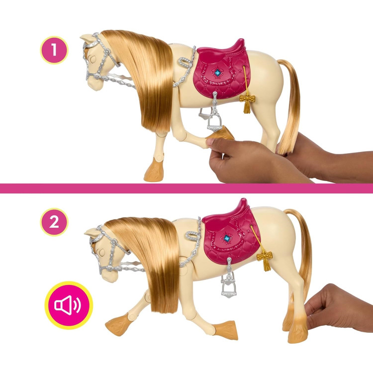 Погрузись в увлекательный мир сериала Netflix «Тайны Барби: Большая погоня за лошадьми» вместе с необычной игрушечной лошадкой по имени Торнадо. Этот интерактивный набор создан для того, чтобы вдохновлять детей на игру, творчество и воображение. Торнадо – не просто конь, а настоящий герой, оживающий с каждым прикосновением, звуком и движением! Лошадка способна двигаться, танцевать и реагировать на взаимодействие, воспроизводя более 20 реалистичных звуков. Нажми драгоценную кнопку на седле, и ты услышишь мелодию из любимого шоу. Потяни за кисти – и Торнадо начнет "танцевать", поражая всех своей грацией. После выступления помоги ему красиво поклониться под громкие аплодисменты – пусть почувствует себя настоящей звездой арены! Но игра не ограничивается только выступлениями — Торнадо тоже очень нежная и заботливая. Погладь его по голове, и он закроет глаза, довольно ржа. А когда он проголодается — накорми морковью, яблоками или овсом из ведерка, которое также можно использовать как ванночку для мытья. Торнадо издает реалистичные звуки жевания – все как в настоящем мире! Дети могут ухаживать за своей игрушечной лошадкой, используя расческу, волшебные заколки и декоративные камни. Создай неповторимый образ для очередного шоу или придуманного приключения! Ты даже можешь выиграть входящий в комплект золотой трофей — ведь с Торнадо каждый день может превратиться в настоящий праздник! Эта игрушка идеально подходит для игры вместе с куклами Барби (продаются по отдельности), помогая детям воспроизвести сцены из сериала или создавать собственные истории. Игровые возможности почти безграничны: участие в шоу, уход за любимцем, бережная тренировка, выступления, прогулки, конкурсы и многое другое.