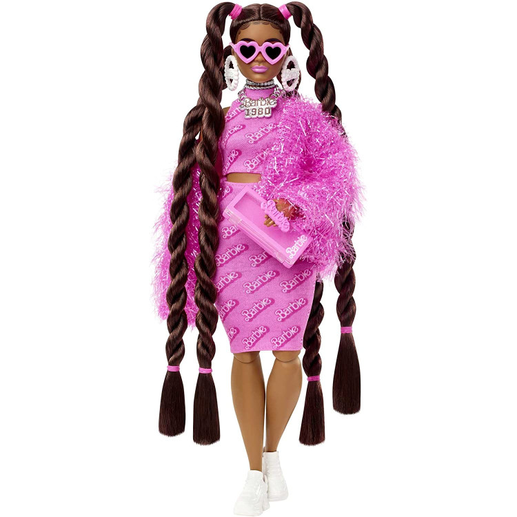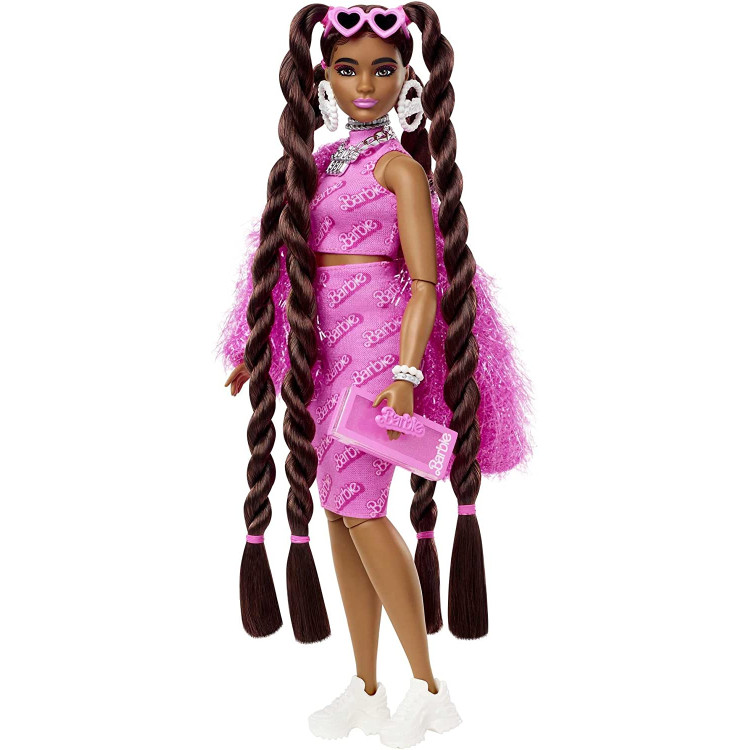 Кукла Барби Extra Doll #14 имеет более пышные формы, чем оригинальный тип фигуры. Образ куклы подчеркивает удлиненные волосы, заплетенные в косички с розовыми резинками. Она демонстрирует свой стиль в полностью розовом наряде из двух предметов с ретро-принтом с логотипом Барби, блестящем розовом жакете и белых кроссовках. Винтажный клатч в стиле упаковки Барби, солнцезащитные очки в форме сердца и множество украшений вдохновляют на самовыражение. Ее домашний щенок тоже очень Extra, с розовыми ушками, розовым ошейником и собственным розовым кабриолетом!