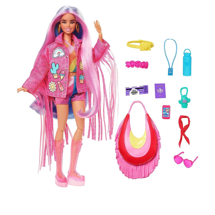 Эта кукла демонстрирует свой уверенный стиль с длинными розово-фиолетовыми волосами, розовой джинсовой курткой с бахромой с разноцветными рисунками, соответствующим комплектом в радужную полоску и розовыми ботинками. Все дело в ЭКСТРА деталях! Кукла Барби поставляется с 15 аксессуарами, такими как розовая цветочная корона, VIP-значок, очки-сердечки и сумка на пояс для камеры, чтобы вдохновить на самовыражение и веселый стиль. Эта посетительница фестиваля имеет большую сумку с бахромой, багажную бирку с кактусом, паспорт, билет на самолет, телефон и бутылку воды.