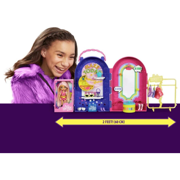 Наслаждайтесь часами развлечения, используя функции «фотокабины» и другие игровые зоны. Гардеробная включает в себя вращающуюся подставку для кукол, зеркало в полный рост и крючки для одежды в форме звезд. Стеллажи в виде полумесяца и облака идеально подходят для хранения и демонстрации коллекции одежды. Дополнительная одежда и аксессуары включают платье-майку, джинсовую куртку, две пары обуви, две сумочки, две подвески и две пары солнцезащитных очков. Есть даже брелок с желейным мишкой! Совершите шопинг с сумкой Barbie Extra Minis, а затем повесьте одежду на блестящую вешалку для одежды с элементами дизайна желейного мишки с помощью четырех вешалок. Этот портативный игровой набор с ручкой для переноски закрывается и помещает все детали внутри для легкой уборки и игры в дороге. С помощью него дети могут создать невероятную атмосферу модного шопинга, где бы они ни были! Ознакомьтесь с целой линейкой кукол Barbie Extra и игровых наборов для любителей моды!