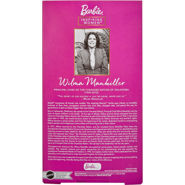 Эта коллекционная кукла Барби чтит память Уилмы Мэнкиллер, непоколебимой защитницы прав индейцев и женщин. Уилма Менкиллер стала первой женщиной-главным вождем нации чероки и без устали боролась за права коренных американцев, женщин и детей. Она посвятила свою жизнь адвокатуре и упорно трудилась, чтобы сделать мир лучше для будущих поколений, получив престижную Президентскую медаль Свободы в 1998 году. Теперь она стала новейшей куклой в серии Barbie Inspiring Women. Кукла, подобно культовому фото Вильмы, несет плетеную корзину и одета в насыщенно пигментированное бирюзовое платье с полосами, символизирующими четыре направления: север, юг, восток и запад. Они символизируют приверженность Вильмы людям во всем мире.