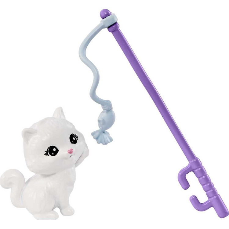 Кукла Барби любит заботиться о своих домашних животных. Дети могут помочь ей ухаживать и воспитывать своих котят с мамой кошкой с игровым набором Barbie Kitty Condo! Этот игровой набор включает куклу Барби, кошку, четырех очаровательных котят с их собственным домиком. Кукла Барби одета в стильное платье со сладким узором отпечатка кошачей лапки и в повседневные голубые кроссовки. Домик имеет несколько уровней и интересных функций: укрытие для подсматривания, корзину, которая двигается вверх и вниз, игрушку-дразнилку и вращающуюся на веревке игрушку. Корзина снимается, чтобы служить кроватью для домашнего животного, а игрушку-дразнилку можно закрепить в руке куклы Барби, чтобы получить двойное удовольствие! Дети могут ухаживать за котятами с помощью аксессуаров, таких как бутылка, щетка и клубок пряжи.