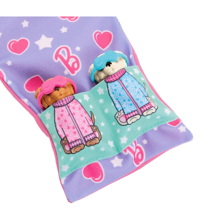 Барби готова устроить щенячью ночную вечеринку! Этот игровой набор включает в себя куклу Барби, двух волшебных щенков, спальный мешок, который подходит для всех трех, и 10 аксессуаров. Кукла Барби готова к веселой ночи в ночной рубашке и тапочках. Каждый щенок имеет маску для глаз для сладких снов! Дети могут превратить мордашку щенка из загрязненной в чистую с помощью холодной и теплой воды. Просто намочите губку для попкорна в воду, чтобы лицо щенка изменилось! Дополнительные аксессуары включают плюшевого мишку, книгу, 3 зубных щетки и 3 маски для глаз.