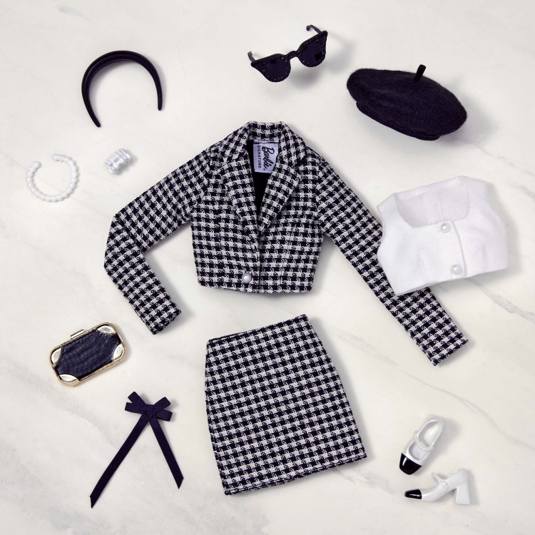 Выбранный по результатам голосования поклонников в аккаунте @BarbieStyle в Instagram, этот набор одежды «Plazacore» предлагает безупречно подобранный и гламурный образ для любимой иконы моды: Барби. С укороченным блейзером и юбкой с гусиными лапками в тон и белой блузкой вы можете создать куклу Барби для моментов, достойных фото, вдохновленных шикарным днем в городе. Ювелирные изделия, такие как колье с "жемчугом" и браслет, вместе с другими аксессуарами, придают шарму ее образу. Берет, повязка, галстук-лента, очки кошачий глаз, клатч, туфли-лодочки подчеркивают ее элегантный стиль.