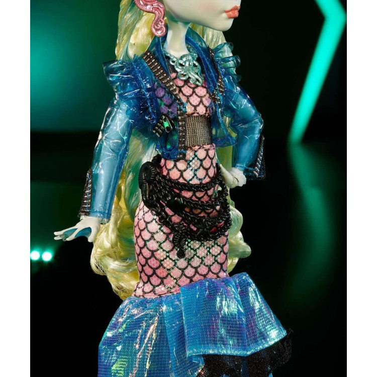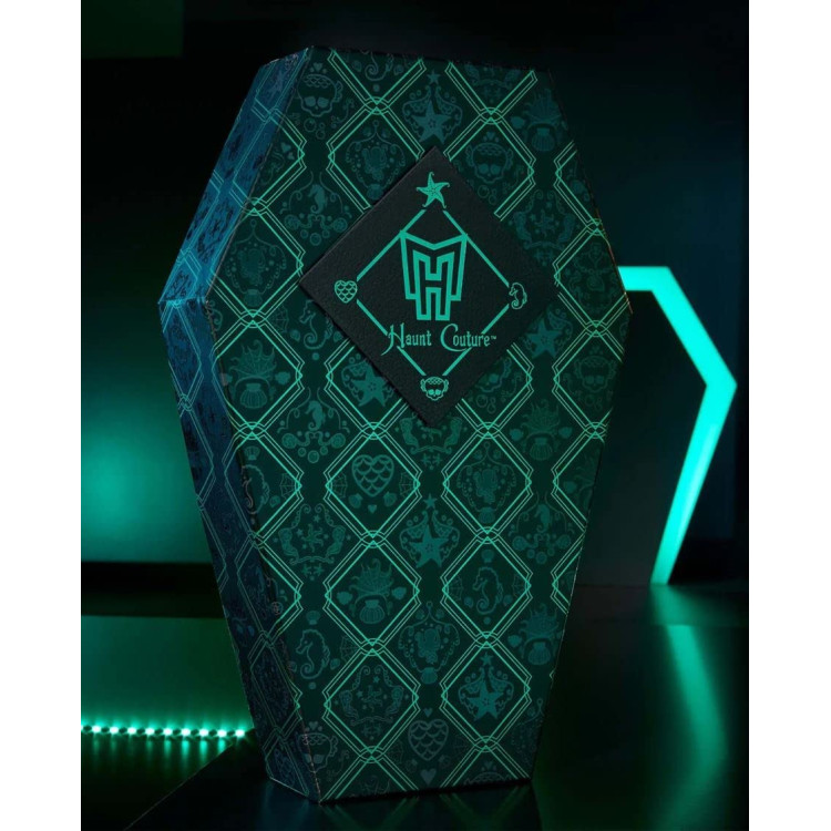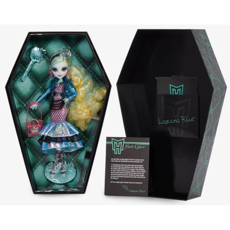 В коллекции Haunt Couture представлены оригинальные куклы Monster High, которые носят невероятно шикарные образы, готовые к показу на подиуме. Эта коллекционная кукла Lagoona Blue, вдохновленная ее непринужденным шикарным стилем морского чудовища, одета в полупрозрачную бирюзовую куртку поверх розового платья с чешуей из сетчатой сетки и блестящих воланов. Туфли на платформе с деталями в форме щупалец, носки с принтом морских звезд, страшно-шикарный кошелек в виде аквариума, пояс на цепочке в морском стиле, головной убор и ожерелье дополняют ее образ высокой моды. У нее прекрасная скульптура лица с накладными ресницами, сверхдлинные волосы с синими бликами и жуткие аксессуары, вдохновленные морем. Эта кукла Haunt Couture Lagoona с фирменной расческой Skullette, коллекционным дневником и премиальной упаковкой создаст волнующую экспозицию. Поставляется с сертификатом подлинности и подставкой для кукол.