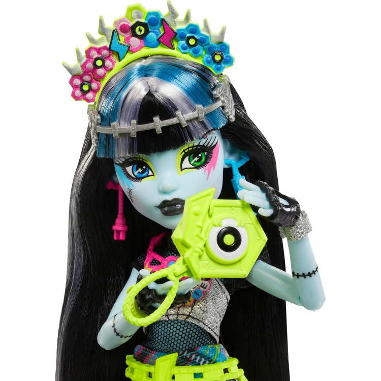 Кукла Фрэнки Штейн из Monster High получила билет на Monster Fest, самый крутой музыкальный фестиваль! В своих блестящих нарядах и аксессуарах "под напряжением" она с нетерпением ждет возможности потанцевать и поесть! Этот монстр готов зажечь на сцене в сетчатом топе и серебристых брюках с асимметричной бахромой. «Цветочная корона», вдохновленная болтами, добавляет дополнительную нотку электрического стиля! Независимо от того, поет ли она в толпе или выступает с группой, ее концертный наряд выделяется роскошными деталями, например серьги со шнуром питания, неоновая сумка на поясе и ботинки в виде диско-шара. Одним из лучших моментов на любом фестивале - еда! Frankie Stein не может дождаться, чтобы заправиться электрическим хот-догом и хрустящим напитком. Фотокамера мгновенной печати идеально подходит для фотографий с упырями! Тематические аксессуары, такие как браслет, плакат с поп-звездой и многое другое, прибавляет веселье на музыкальном фестивале.