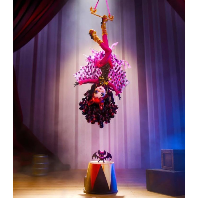 Приглашаем вас всех в жуткий цирк, где вы сможете насладиться невероятным выступлением и наградить громкими аплодисментами самого смелого акробата всех времен – фантастическую Дракулауру! Шоу возвращается, и оригинальная кукла Дракулаура дебютирует у Freak Du Chic. Она чувствует себя как рыба в воде, качаясь в воздухе в увлекательном костюме вампира-летучей мыши с волосами, уложенными в объемные локоны. Благодаря ее смертоносным туфлям на платформе она надежно держится на трапеции. Ее устрашающее появление поражает: крылья летучей мыши, украшенные арлекинским рисунком, и полосатый хвост.