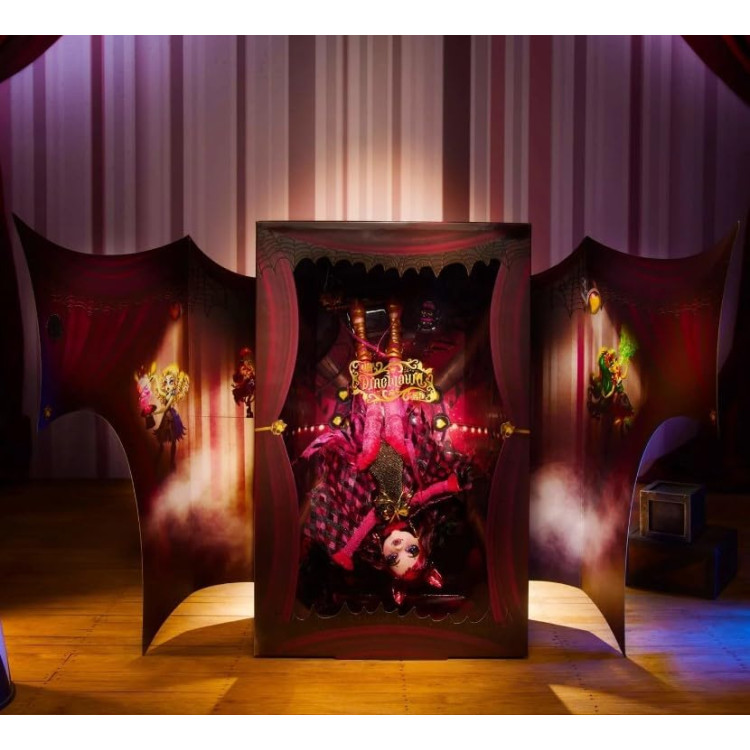 Премиальная упаковка позволяет выставлять куклу Дракулауру вверх дном или наоборот. Также в наборе есть подставка и фигурка Графа Фебулоуса в костюме клоуна.