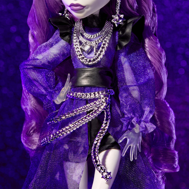Monster High Haunt Couture возвращается в 2023 году с новой коллекцией Midnight Runway. Фрэнки, Клео и Спектра – три упыря, получат обновленный вид и уникальную маскарадную маску для каждого персонажа. В этой увлекательной серии Monster High Haunt Couture Midnight Runway Collection Спектра Вондергейст появляется жутко прекрасной. Она – потрясающее призрачное создание с гламурным маскарадным макияжем. Одета в воздушное платье в готическом стиле из сетки, с рукавами-буфами и кожаными акцентами. Ее длинные фиолетовые накрученные локоны и скульптурная маска придают ей неземной шарм. Серебряная цепочка и полупрозрачные детали на руках и ногах отражают ее призрачное наследие. Кукла имеет шарнирную конструкцию для максимальной гибкости и подвижности. Кроме того, в комплекте есть аксессуары и поздравительная открытка. Кукла представлена в текстурированной премиальной упаковке с сертификатом подлинности, а также имеет подставку для кукол.