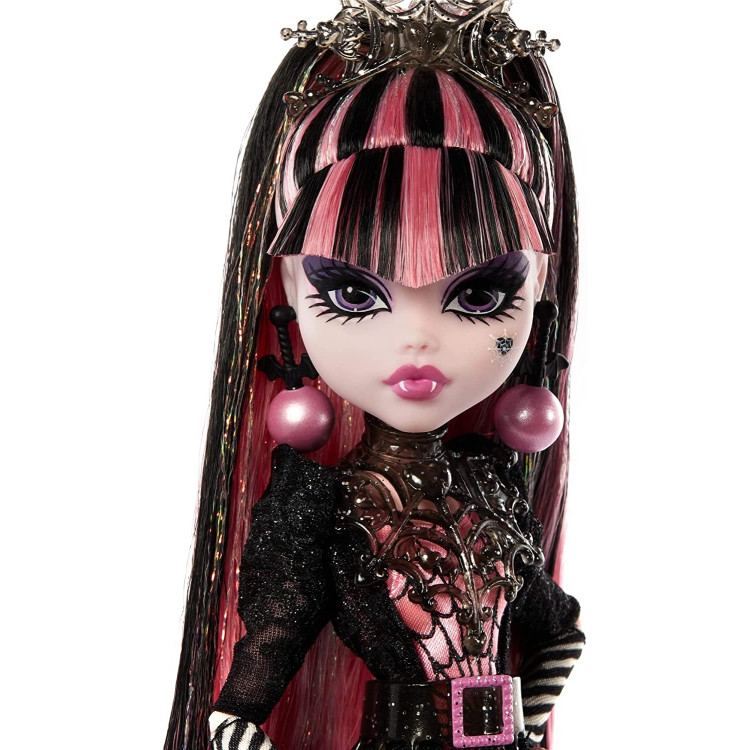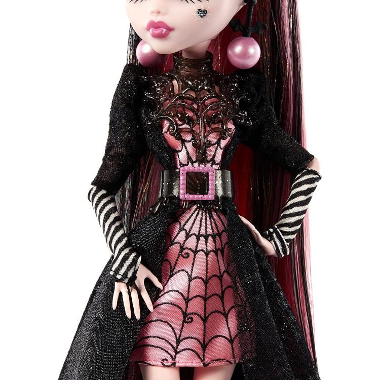 Monster High желает тебе жутких праздников и счастливого нового страха! Праздничная зимняя кукла специально выпущена к новогодним и рождественским праздникам. Нет лучшего способа отпраздновать праздники, чем нарядится в праздничное одеяние. Кукла Дракулаура встречает праздники в мерцающем наряде, являющемся вершиной ужасающей моды. Страшно шикарное атласное мини-платье вампира с паутиной сочетается с прозрачной черной накидкой украшенной снежинками, стянуто вместе эффектным поясом. Прическа с розовыми прядями, поразительная корона, перчатки в виде праздничного леденца Candy cane и большие декоративные серьги, напоминающие новогодние елочные игрушки-шары, дополняют ее жуткий образ. Блестящие сапоги на платформе идеально подходят для танцев всю ночь. Пусть ваши праздники будут ужасными! Полностью шарнирная кукла.