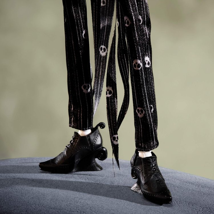 Джек одет в его известный черный смокинг с тонкой полоской и галстуком-бабочкой в форме летучей мыши. Его обувь – это оксфорды на высоком каблуке. В свою очередь, Салли имеет свои культовые швы, длинные рыжие волосы и платье в стиле пэчворк, которое получило усиленное воплощение в кутюр. Платье Салли дополнено кружевным подолом в виде паутинки, подчеркивающей ее каблуки-бутылочки с снадобьем. В ее сумочке находится катушка нитей, на случай если ей понадобится подшить себя. Ярко-рыжие волосы Салли, детали вышивки и лица с украшениями с чертополохом и повязка с бантом на голове дополняют ее скульптурный вид. Рост Джека составляет 30,5 см, тогда как Салли – 27 см.