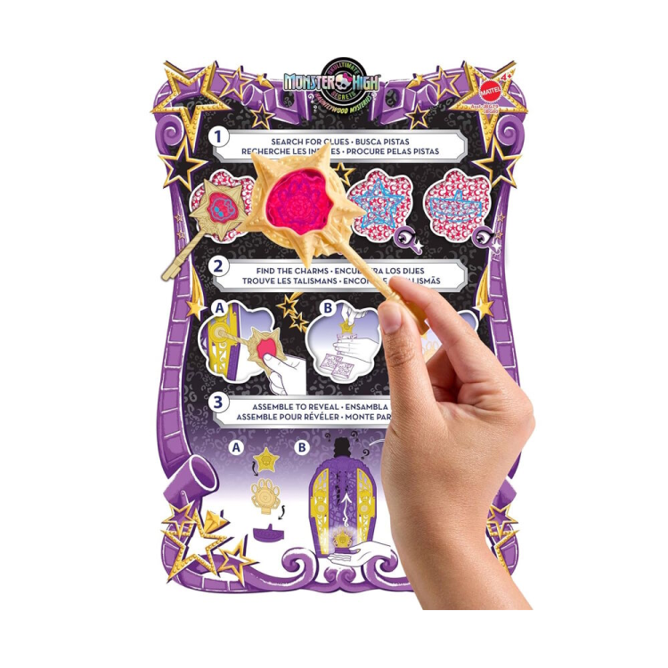 Окунитесь в мир тайн и гламура вместе с набором Skulltimate Secrets: Hauntlywood Mysteries! Разгадайте загадки, скрывающиеся за дверцей волшебного шкафа, и раскройте историю исчезновения Клодин Вульф. Клодин отправилась в Хаунтливуд, но пропала без следа! Детям предстоит пройти три жутко-веселых этапа: разгадать, разблокировать, раскрыть. Вооружившись магическим ключом с лупой, они будут искать подсказки на карте сокровищ. За символами на карте скрыты амулеты, которые нужно найти среди сюрпризов, достойных красной дорожки. По дороге они откроют для себя более 19 гламурных сюрпризов – от сияющих нарядов до ужасающе-крутых аксессуаров, таких как перчатки до локтя и блестящие украшения. Соединив три амулета в один талисман, вставьте его в специальный слот шкафа и активируйте механизм – и Клодин Вульф появится во всей своей звездной красоте! Повторяйте игру снова и снова для новых открытий и комбинаций. Когда Клодин найдена — пора готовиться к выходу на сцену! Благодаря более чем 125 возможным комбинациям одежды, дети смогут создать множество стильных образов для настоящей звезды Хаунтливуда. После игры все элементы – куклу, одежду и аксессуары – можно удобно хранить в шкафу. Набор идеально подходит как для творческих игр, так и для хранения любимых вещей.