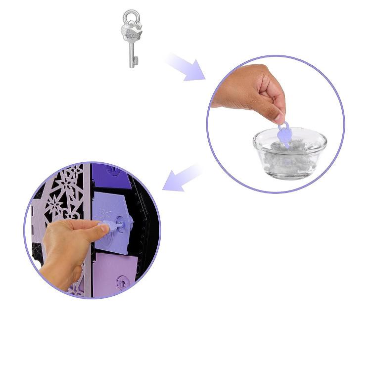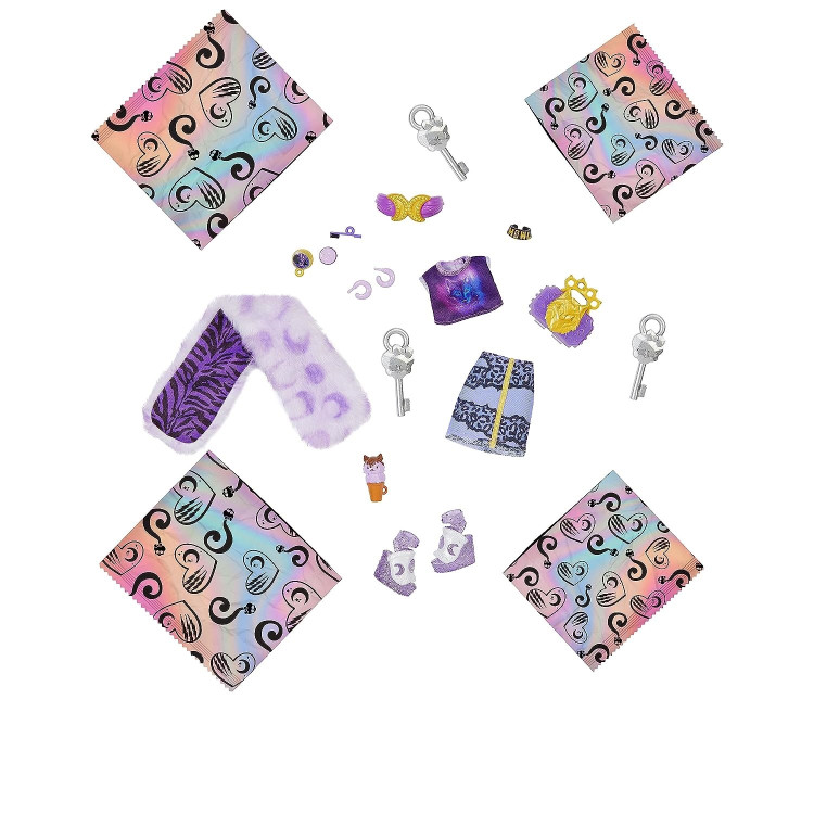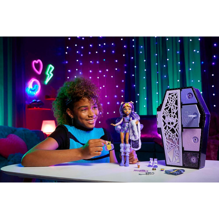 Кукла Clawdeen Wolf и ее модные сюрпризы сияют невероятно блестящими перламутровыми деталями в этом ужасающем издании Skulltimate Secrets! Откройте его шкафчик и найдите фантастические находки внутри. Сможете ли вы раскрыть все секреты? Возьмите четыре ключа и смойте их ужасающее покрытие на мгновение, а затем откройте все четыре соответствующих отделения, чтобы найти скрытые предметы. Распаковав коробку, используйте шкафчик в форме гроба, для рассказа невероятных историй, а также для хранения куклы Клодин Вульф и всех ее вещей и аксессуаров. Она убивает своим видом с фиолетовыми волосами омбре. Ее удивительные модные наряды подчеркивают ее уникальный шарм оборотня и позволяют экспериментировать со стилями! Благодаря гибкости туловища, локтей, запястьям и коленям, вы сможете создавать невероятные монстратические позы. Skulltimate Secrets предлагает множество предметов, которые разыгрывают воображение и проявляют стиль: от меховой палантины и повязки на голову до сумочки и сладких закусок. Сочетайте их, чтобы создать много различных образов!