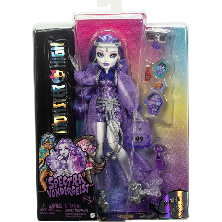 Monster High представляет Спектру Вондергейст - ужасное привидение, которое любит испытывать свои страхи на друзьях! Кукла Monster High Spectra Vondergeist - воплощение призрачной грации в своем фиолетовом облике, с множеством деталей, подчеркивающих ее жуткую стилизацию. Спектра Вондергейст щеголяет в наряде, идеальном для фантастического призрака, вроде нее самой. Кроме того, она идет со своим домашним хорьком Руэном и множеством пугающе-крутых аксессуаров! Это призрачное создание готово скользить по коридорам в своем прозрачном плаще, в блестящем комбинезоне, серебристом поясе из цепей с шариками и соответствующих туфлях. В комплекте с ней идет множество пугающих аксессуаров, которые будут вдохновлять воображение: рюкзак, напиток, солнцезащитные очки, призрачные наггетсы с соусом из призрачного перца, а также телефон и планшет iCoffin! Spectra Vondergeistт готова отправиться во все свои любимые места со своим любимцем Руэном — таинственным хорьком, который выглядит так, будто материализовался из тумана! Ознакомьтесь со всей коллекцией кукол и игровых наборов Monster High, чтобы вдохновиться на еще больше модных развлечений и страшных приключений!